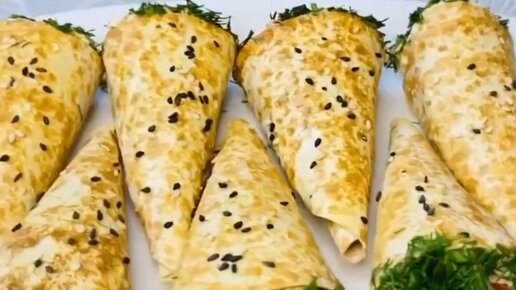 Берем лаваш круглой формы и разрезаем его пополам. Если под рукой нет готовых круглых лавашей, можно вырезать с помощью тарелки из обыкновенного листа лаваша. Заворачиваем разрезанные половинки в виде кулька, края смазываем водой чтобы не развернулись и выкладываем на противень швом вниз...