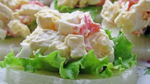 Публикуем ещё один рецепт праздничной закуски. Это блюдо сразу же привлекает к себе внимание, и исчезает со стола в одно мгновение. Даже не сомневайтесь, это стоит приготовить! Отварить вкрутую 2 – 3 яйца, остудить, почистить от скорлупы и порезать мелким кубиком. 100 – 150 грамм крабовых палочек также мелко нарезать кубиком. 100 грамм нежирного твёрдого сыра натереть на мелкой тёрке. Яйца, крабовые палочки, сыр сложить в глубокую миску, заправить 1 – 2 столовыми ложками натурального йогурта, добавить специй и соль на вкус, всё перемешать...