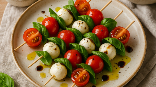 Рада снова видеть вас на канале «Рецепты от Дарики», где мы готовим не только сытные обеды и ужины, но и изысканные, простые и невероятно вкусные закуски. Сегодня поделюсь с вами рецептом, который всегда вызывает восторг у гостей — это шпажки с моцареллой, черри и базиликом. Эта закуска пришла к нам из итальянской кухни и по сути является «капрезе на шпажке». Сочетание сочных томатов, нежной моцареллы и ароматного базилика — это гармония вкусов, дополненная капелькой оливкового масла и лёгким бальзамическим соусом...