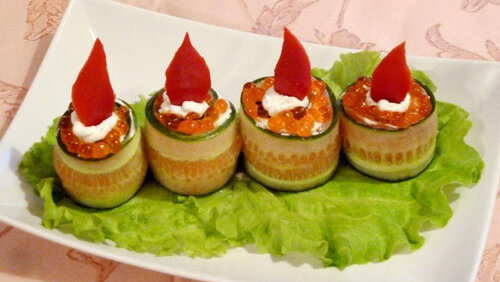 Оригинальная, изысканная закуска прекрасно подойдет не только к Рождественскому ужину, но и прекрасно впишется в меню романтического вечера для двоих! Состав: Огурцы — 1 шт. Семга или форель (малосольная) — 150 гр. Сыр мягкий (Филадельфия) — 150 гр. Перец болгарский (красный) — 1 шт. Икра красная — 2 ст. л. Калорийность: 100 гр. = 170 кк. Приготовление: Огурец нарезаем тонкими полосочками. Семгу стараемся нарезать такими же тонкими ломтиками.
