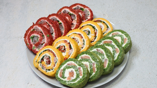 Рецепт для коржа с размерами 25Х30 см. 1) Зеленый рулет из шпината. Для теста: 230-250 г замороженного шпината или 150 г свежего 3 яйца С1 1/3 ч. л. соли 50 г муки 1 ст. л. растительного масла Для начинки: 200-220 г творожного сыра 150 г малосольной красной рыбы 2) Жёлтый рулет из моркови. Для теста: 150 г варёной моркови 3 яйца С1 1/3 ч. л. соли 50 г муки 1 ст. л. растительного масла Для начинки: 200-220 г творожного сыра зелень укропа 50-60 г вяленых томатов 50-60 г ветчины 3) Красный рулет из свёклы...