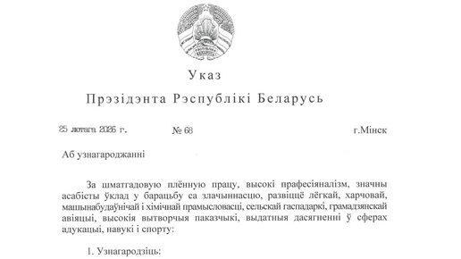 Глава государства Александр Лукашенко 25 февраля подписал Указ №68, согласно которому государственных наград удостоены 32 представителя самых разных профессиональных сфер. Высокие отличия - ордена, медали и почетные звания - присвоены за многолетнюю добросовестную работу, высокий профессионализм и личные заслуги перед республикой. В указе особо подчеркивается вклад награжденных в борьбу с преступностью, развитие легкой, пищевой, машиностроительной и химической промышленности. Также отмечены достижения в сельском хозяйстве, гражданской авиации, образовании, науке и спорте...