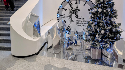 О концерте в Зарядье я немного расскажу, конечно. Но, как я поняла, мало кто из читателей жалует мои рассказы про концерты классической музыки. Потерпите, друзья мои, я коротенечко. А потом покажу новогоднее украшение фойе концертного зала, очень надеюсь, что эти картинки поднимут вам праздничное настроение. Для этого всё мной и затевается - чтобы вы стали радостнее, а, значит, мир хоть чуточку, но лучше. Концерт проходит в рамках зимнего фестиваля, вот плакат соответствующий (на циферблате часов) Играл Государственный академический симфонический оркестр Республики Татарстан...