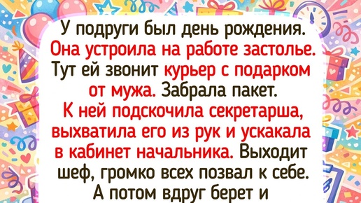 Семейные застолья и дружеские посиделки редко проходят строго по плану, но именно форс-мажоры превращают обычный ужин в легендарное событие. Часто вместо чинных бесед за столом разворачиваются настоящие комедии положений или драмы с неожиданным финалом. Кстати, порой даже жадность родственников или пустой стол становятся отличным поводом посмеяться и сделать выводы. У подруги был день рождения. Она устроила на работе застолье. Тут ей звонит курьер с подарком от мужа. Забрала пакет. К ней подскочила секретарша, выхватила его из рук и ускакала в кабинет начальника...