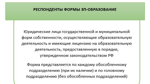 Респонденты и получатели формы Форма ЗП-образование относится к формам статистического наблюдения, сдавать которые требуется не всем подряд, а строго определенным для каждого вида отчетности категориям юрлиц и ИП. Как получить коды статистики по ИНН, читайте здесь. Кто отчитывается по форме ЗП-образование в 2024 году: Ожидают рассматриваемую форму ЗП-образование в территориальном органе Росстата. Кроме того, ее следует сдать в соответствующий орган управления, осуществляющий функции и полномочия учредителя...
