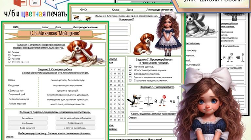 Рабочий лист С.В. Михалков "Мой щенок" Литературное чтение 2 класс с ответами для учителя , можно редактировать. Задания размещены на 2-х листах ( можно использовать двухстороннюю печать для экономии бумаги) Два файла для печати на Ваш выбор : цветной и черно-белый (оттенки серого) Формат pdf и формат pptx ( с возможностью редактирования файла) Иллюстрации в высоком разрешении. Рабочий лист состоит из 9- ти разноплановых заданий , рефлексии+ лист с ответами для учителя. Задания: 1. Определи жанр произведения? Выбери верный ответ и отметь галочкой (V)...