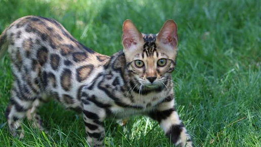 Бенгальская кошка (Prionailurus bengalensis) – это одна из разновидностей короткошерстных кошек/ Главное достояние такого животного – удивительная схожесть с дикими элегантными представителями семейства - леопардами. Эти кошки довольно крупные: самки несколько стройнее и красивее котов, а самцы более мускулистые и выносливые. Половой диморфизм выражен ярко: коты достигают 7-8 кг, кошки – более 5. Если присмотреться, голова похожа на широкий округлый клин, нос кошки довольно большой, ушки закруглены, а вот кисточки на ушах – это дефект...