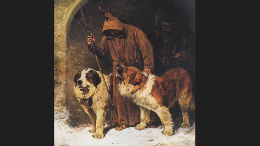 Все знают симпатичную породу собак по названию сенбернар. Это большие умные псы, достаточно шерстяные, их призвание — спасение людей из-под снежных завалов в горах. Этих прекрасных животных с любовью изобразил художник Джон Эммс в своих картинах. На первой из них — "Спасатели", показаны два сенбернара, выдвигающиеся вместе с монахом в горы на поиски пострадавших от лавины. Обратите внимание, что на шее одного из них висит бочонок. Там вино, которое давали откопанным из-под снега людям, чтобы согреть их и привести в себя...