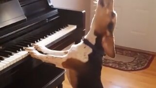 Собака породы бигль играет на пианино и поёт баллады