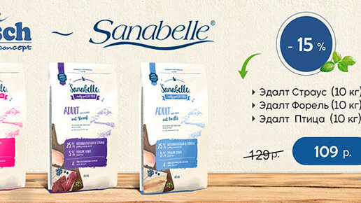 Акции для кошек: 10кг корма Bosch Sanabelle по цене 109руб. вместо 129руб. В акции участвуют: Бош Санабелль Эдалт с форелью (10кг)