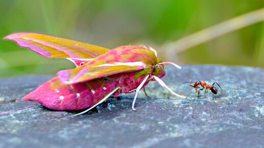 Вы только посмотрите на этот удивительный и трогательный кадр! Это не фотомонтаж. На этом уникальном снимке — бабочка «Винный бражник» (фотография сестры Разифы), а рядом — муравей. Но посмотрите, что у муравья в лапках или в челюсти — это же какое-то зёрнышко, похожее на угощение, которое муравей любезно как будто бы предлагает бабочке, или так хочется думать. Эта восхитительная фотография вызвала у меня интерес к этой красивой бабочке. В этой небольшой публикации охотно делюсь своими познаниями в сфере образа жизни этих чудесных созданий...