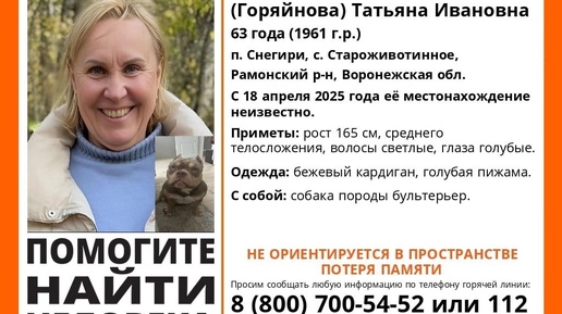 18 апреля в посёлке Снегири пропала 63-летняя Татьяна Перцева. Она ушла гулять с бультерьером и не вернулась. У женщины — проблемы с памятью. Поисками занимается «ЛизаАлерт». Развёрнут штаб, задействовано 16 пеших групп...
