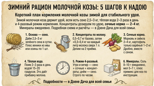 Зимой молочная коза даёт стабильный удой, если держим три опоры: высокое сено 2,5-3 кг в день, концентраты по удою и тёплую воду 2-3 раза в сутки. Рабочая схема кормления такая: 4 приёма корма по часам, сочные корма 2-4 кг в день, минеральные добавки ежедневно. В этой сборке я объясню, как мы выстраиваем рацион, на что ориентируемся по дозам и что реально влияет на молочную продуктивность коз в условиях российского стойлового периода. Скрипит морозное утро, из ведра поднимается пар, коза тянется к тёплой воде, потом неспешно хрустит люцерной...