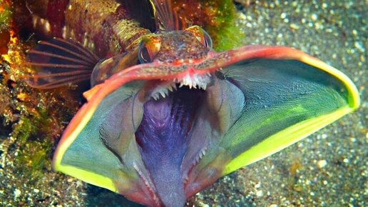 Этот устрашающего вида морской хищник (лат. Neoclinus blanchardi) – представитель семейства хенопсиевых, или щучьих морских собачек. Его главное оружие – огромный рот, который одновременно является признаком превосходства над другими особями. Чтобы выяснить, кто же главней, два самца Neoclinus blanchardi широко открывают рты и прижимаются губами друг к другу. Со стороны это выглядит крепким поцелуем двух приятелей, однако в этот момент оба самца испытывают друг к другу далеко не дружеские чувства...