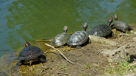 Кроме птиц, у нас на прудах живут черепахи, и количество их постоянно увеличивается. В большинстве это красноухие пришельцы. Значительно реже встречаются наши местные болотные черепахи, которых вытесняют красноухие. Сейчас, несмотря на приближение осени все обитатели активно размножаются. Взялись за размножение и красноухие черепахи, видно, решили, что их мало на этом свете. Недалеко от пруда, возле скамейки, рептилия хорошо смочила землю, выкопала ямку, отложила яйца, интересно, сколько, может быть и двадцать...