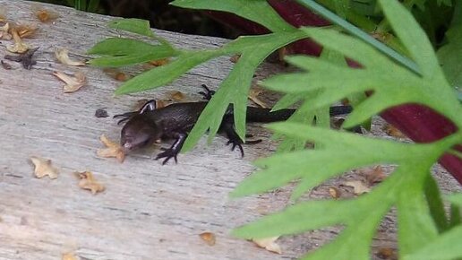Наклонилась над грядкой, чтобы вырвать морковку, и увидела, как в разные стороны брызнули сразу три крошечных ящерки. Они были совсем крохи, 2-3 см в длину и совершенно черные, хотя взрослые особи ящерицы обыкновенной, живущие на нашем участке, имеют коричневую узорчатую окраску. Так вот пока я выискивала на грядке морковь покрупнее, малышки то и дело сновали прямо под руками, сколько их - я затрудняюсь ответить, мне кажется было 5 или 6 штук. Ящерки очень полезны для садоводов, поедают насекомых...