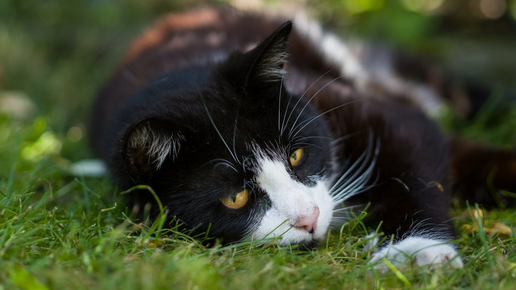 Совершенно волшебный черный кот с желтыми глазами у дорогого ресторана