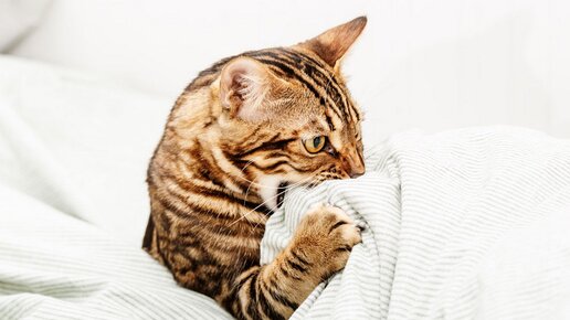 Почему кошки топчут и кусают одеяла, и что с этим делать