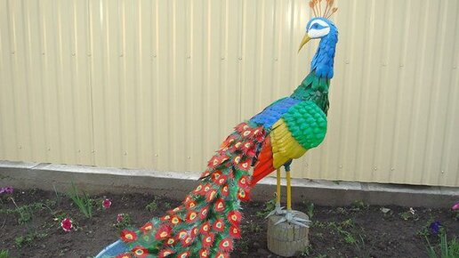 Павлины — необычайно красивые птицы. Можно любоваться их хвостом целую вечность. Жаль, что не в каждом дворе можно увидеть такую красоту. Хотя, ситуация поправима! Можно смастерить великолепного павлина с длинным хвостом из обычной пластиковой тары. Для работы подойдут такие материалы: пенопласт; канцелярский нож; металлический прут; подставка (полено); старая канистра; металлическая сетка; проволока (толстая и тонкая); шило; пластиковые бутылки всевозможной величины; ножницы; краска эмаль разных оттенков...
