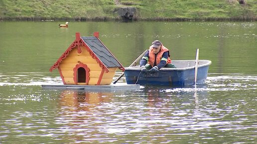 Шале для утки! На столичные водоёмы с наступлением тёплой погоды возвращаются не только птицы, но и их домики. Сегодня плавучие избушки запускали на пруду у Новодевичьего монастыря. Их привезли на грузовике, на лодке доставили ближе к середине акватории и зафиксировали специальными якорями. Домики ставят там, где удобнее самим птицам. Утята любят там отдыхать после долгих заплывов...