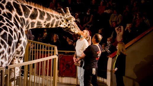 В Тверском государственном цирке сейчас идет программа с дикими животными, среди которых особенно выделяются белый лев и жираф. Я пришла на репетицию, чтобы посмотреть на то, как обращаются с животными в цирке и как проходит процесс дрессировки. На манеже я увидела дрессировщика Михаила и жирафа Багира. Жираф оказался поляком (понимает команды и речь на польском языке, именно так с ним общался Михаил). Багиру уже 17 лет, это примерно половина его жизни. Отметим, что в дикой природе жирафы живут около 25 лет, а в неволе – на 10 лет больше...