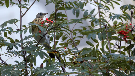 Есть такие дрозды, что зовутся — Рябинниками. И оттого они так зовутся, что питаются рябиной! Конечно же, не только ей, а и другими ягодами, насекомыми, по весне червяками они тоже питаются, и выкармливают червяками потомство своё... Я привык видеть их копающими газоны весной и летом... А вот объедающими ягоду — зимой! Осенью они тоже с удовольствием лакомятся ягодами в лесах и садах, от чего их очень не любят различные садоводы, и бывает даже их отстреливают (а некоторые и в пищу отстрелянных дроздов употребляют, из серии — чего добру пропадать?)...