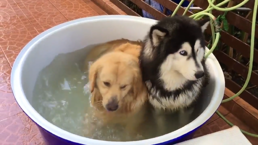 Ретривер и хаски купаются в одном ведре