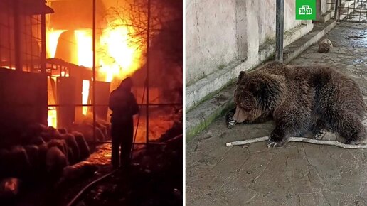 [ Смотреть видео на сайте НТВ ] Ночью в Евпатории вспыхнул сильный пожар в контактном зоопарке. Спасены женщина и несколько животных. Пожар произошел в контактном зоопарке на территории «Тропик парка» в Евпатории. Огонь полностью охватил здание на 625 квадратных метрах. Конструкции обрушились. Тушение пожара осложнялось тем, что в вольерах находилось сено. Сотрудникам МЧС удалось спасти из горящего помещения женщину, ее передали врачам, и вывести двух медведей, специалисты отстояли от огня их вольер...