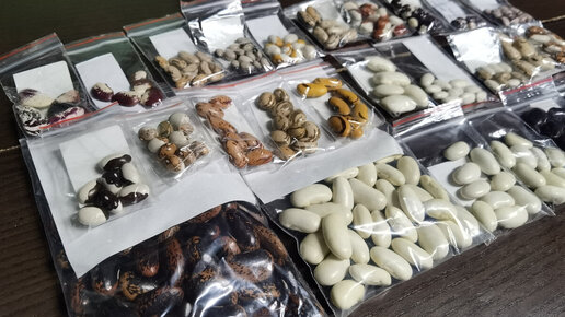 Ну что же, кто о чем, а я продолжаю "чахнуть" над своей фасолью)) Я не делала обзора на вьющиеся сорта, вот исправляюсь. Вообще, надо сказать, я получила столько эмоций от удивления до восторга распаковывая посылки с заказанной фасолью, что уже за одно это можно покупать семенной материал)) Поразил размер - как большой, так и маленький. И цвет - иногда совершенно похожий на самоцветные камни. Вот оно мое богачество. Начнем с сортов со среднего размера зерном. Таких сортов много. Слева направо - сорт Пингвин, Глаз тигра, Снежная шапка, Пинто, Маррон, Кавказская...