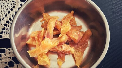 Очень простой рецепт! Понадобится только тонкое филе куриной грудки, примерно 300 г. Этапы приготовления Где и как хранить? Хранить в плотно закрытой ёмкости до 20 дней. Главное чтобы курица была полностью сухая, иначе неизбежно возникновение плесени. Если сомневаетесь, то можно хранить в холодильнике. Можно ли скормить всю закуску за раз? Такое филе курицы не является частью основного рациона. Разные вкусности для собак (печеньки, закуски) должны составлять не более 10% от основного рациона...