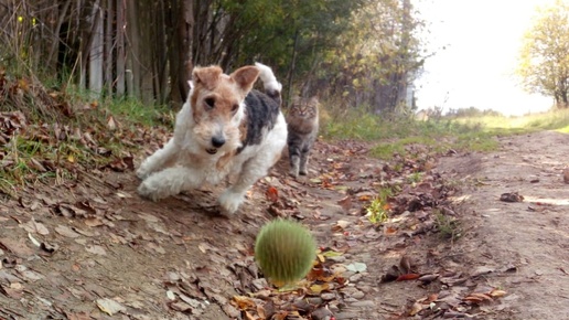 Мурзик и Иржи на прогулке: фокстерьер и кот гуляют