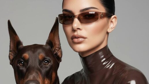 Модель: Nano Banana Сгенерировать🪄 Крупный план модели и добермана в модном редакционном стиле. Модель одета в блестящее темно коричневое латексное платье с горлом, кожа детализирована с высокой четкостью, показывая каждую контурную линию и блеск. Девушка и собака смотрят прямо с камеру Шерсть добермана темно коричневая, гладкая, детализированная, с четко видимыми отдельными волосками Оба находятся на нейтральном фоне, чтобы подчеркнуть контраст их блестящих, отполированных образов. Основное внимание...