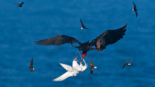 Добро пожаловать в мир бесконечных сражений за еду. Представляем вашему вниманию птиц, которых англичане прозвали «птицы-солдаты», из-за постоянных облав на чаек, пеликанов и др. пернатых собратьев, с целью отъема еды. Почему они промышляют разбоем? Ленятся охотиться сами? Чтобы ответить на эти вопросы, познакомимся с ними поближе. Внешне-это большие птицы с размахом крыльев до 2,2 метров с гигантским клювом в 38см, относятся к семейству фрегатовых. Дальнейшее описание характеристик не соответствует большой хищной птице...