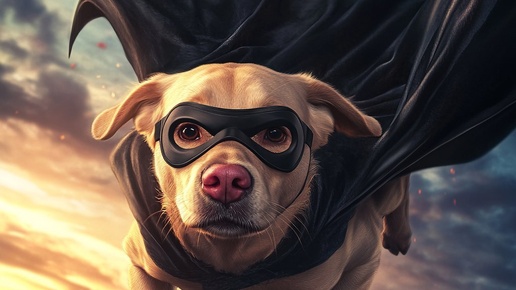 Создано на основе запроса: A realistic Golden Labrador Retriever with a pink nose, wearing a playful black superhero-style mask similar to Batman's and a flowing black cape, flying through the sky in a dynamic superhero pose. The dog’s ears and cape ripple in the wind as it soars above a glowing city skyline during golden hour. Dramatic lighting, realistic fur details, cinematic atmosphere, action-packed composition...
