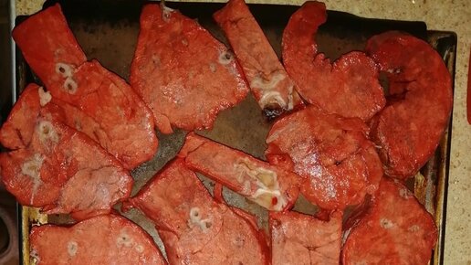 Говяжье лёгкое - популярное лакомство для дрессировки, которое очень любят собаки (и правда, запах приготовленного субпродукта никого не оставит равнодушным :-)) Именно его я чаще всего использую для игры "Вкусное дерево" (подробнее о правилах можно почитать ЗДЕСЬ) Недавно принесла домой 15 кг и сушила его три дня и три ночи... В первую очередь я положила пару кусков легкого в морозилку на 2 часа. Подмороженное легкое хорошо режется на порционные кусочки. Я предпочитаю делать "стейки" толщиной 1 см (в процессе высыхания куски уменьшаются в размере)...