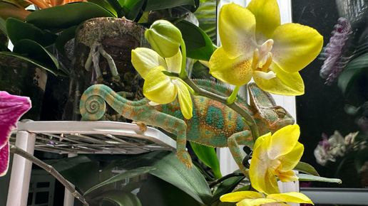 Всем привет! Наконец, я написала эту статью о содержании йеменского (шлемоносного) хамелеона. Попыталась вместить все!   Знакомьтесь, это Геннадий.  Мне подарили его 21.12.2024 года (я давно хотела ящерицу, изучала разные виды и планировала завести когда-нибудь, а тут - сюрприз). На тот момент ему было примерно 3 месяца. Сейчас 28.04.2025 года, то есть Геннадию около 7 месяцев.  Когда я подготавливала террариум для питомца, я перечитала и пересмотрела кучу материала, советовалась с местным герпетологом...