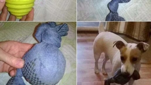 Игрушки для собак бывают разные. Они бывают в форме шариков, колец, канатов. Вот три способа как сделать игрушки для собак своими руками: 1 способ. Нужно взять носок и теннисный шарик. Шарик надо засунуть в носок. Носок нужно завязать с двух сторон. Игрушка готова! 2 способ. Нужно взять старую футболку. Её надо разрезать на три полоски. Они должны быть примерно по 40 сантиметров в длину. Полоски нужно сложить вместе и завязать с одной стороны...