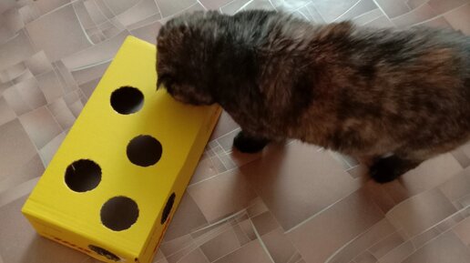 чера пришла мне посылка в небольшой картонной коробке. Я забрала содержимое, а упаковку хотела было, как обычно, выкинуть, но что-то передумала. Неожиданно пришла мне "гениальная" идея сделать из нее своей кошке игрушку. На ютубе я видела несколько видео, как домашние питомцы с радостью играют с небольшими контейнерам, в которые спрятаны их любимые игрушки. Ну а почему бы не сделать такое развлечение для домашней питомицы самой. Я нарисовала ручкой круглые отверстия на коробке сверху и сбоку...