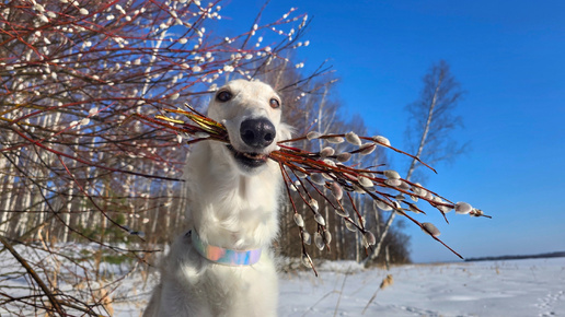 Видали, какие умняшки: борзая и две хаски позируют для открыток с веточками вербы