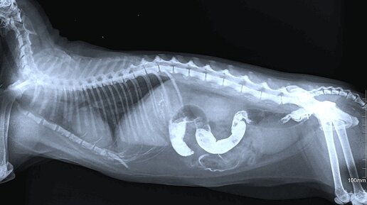 Второе обследование прошло быстрее. Рассматривая «стереокартинки» на экране, доктор сказала, что Тигре светит рентген с контрастом. Рентген с контрастом Сначала делают снимок без лекарства. И, поехали. Вещество, введенное для контраста, – сульфат бария. Может быть в виде порошка, пасты, суспензии. Тигре он достался в виде чего-то, разведенного в кефире. Принцип действия. Барий подсвечивает исследуемые органы белым цветом (в нашем случае – область ЖКТ). Животинке выпаивают барий и несут делать снимок...