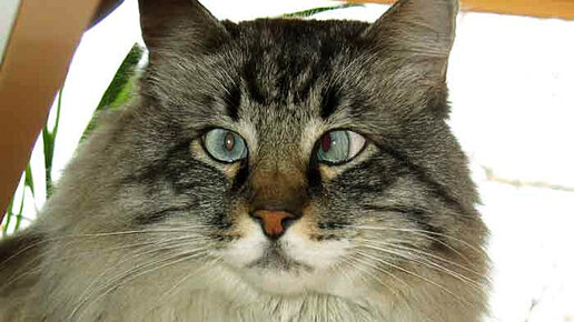 Это наш красавец Кусама, уникальный косоглазый кот. Он ровесник терактов в Нью-Йорке и Вашингтоне, отсюда и имя. Произошел от простой деревенской кошки Тигры и прохожего сиамского кота. Характер очень независимый, людей не уважает и не любит. Никогда не ласкается. Зато очень любит всех остальных кошек и собак. А недавно Куся заболел. Сердечный приступ. Бедный кот спал в густой тени под елкой возле беседки, когда началась первая в этом году гроза. Гроза налетела внезапно - с громом, ливнем и градом...