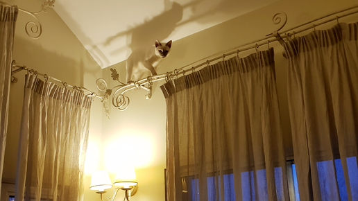 Практически сразу, едва кот Митя появился у нас и освоился, он стал изучать всевозможные высоты в доме. Для него буквально не существовало преград. Холодильники, шкафы, верхняя часть душевой кабины, любая открытая дверь и ее верхняя часть... Покушения были даже на люстры, но, к счастью здесь, эти возможности Мити ПОКА ограничены законами гравитации и расстоянием до люстр :)) Мы пытались препятствовать. Ворчали, выговаривали, брызгали из пульверизатора, когда он скакал как мартышка по верхам. Воду он не любит и нехотя спрыгивал, но, когда мы уходили - он спокойно повторял свои подвиги...