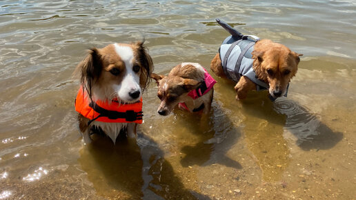 В эти выходные мы решили отвезти наших креветочек на местный пляж и научить из плавать. В прошлом году, одна попытка была у Булочки и она практически научилась плавать. В ясный воскресный денёк, мы впятером уже стояли на побережье небольшого подмосковного водохранилища и смотрели на людный пляж. Наше появление как всегда не осталось незамеченным, многие люди с интересом смотрели на нашу компанию, состоящую из двух человек и трёх собак. Булочка и Печенька гордо выхаживали на своих колясках, а Патрик восседал на сережиных руках...