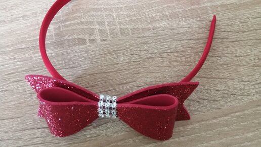 Всем привет! Сегодня я хочу показать вам изготовление бантика для ободка с фоамирана. Фоамиран очень интересный материал. Он легко сварачивается, если это требуется и не рвётся. Я пользуюсь как китайским, иранским так и глитерным фоамираном. Сегодня именно глитерный мы и будем использовать. Итак, для работы нам понадобиться. Фоамиран глитерный, я взяла красный. Готовый шаблон для бантика. Бантик состоит из двух частей. Стразовая лента. Вернее имитация страз. Она стоит намного дешевле, чем лента с настоящими стразами...
