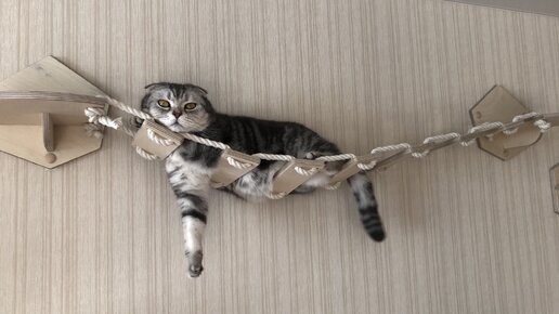 Известно, что кошки любят высоту, так как с высоты легче заметить приближение другого кота или любого «врага». Так же кошки любят уединение, где можно отдохнуть от всех домочадцев. Мостик прекрасно подходит под эти запросы. Его можно вешать на любую высоту, комфортную для кошки. Вы также можете использовать мост, как способ перехода на другие поверхности и в комплексе с другими изделиями. Изготовлен из качественной фанеры толщиной 12 мм и каната ХБ. Мостик состоит из 7 ступеней и двух полок, скрепленных канатом...