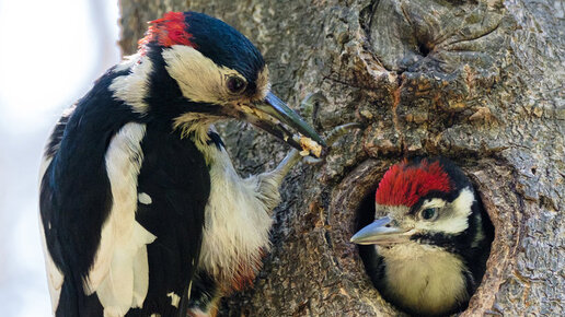 Дятел-папа кормит своего птенца