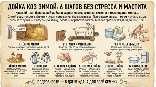 Коротко по сути. Зимой дойка козы должна проходить в тёплом, сухом помещении при +6…+8 °C, без сквозняков. Перед дойкой вымя моем тёплой водой, обязательно вытираем насухо, первые струйки сдаиваем в отдельную чашку, после — обрабатываем соски послевыменным раствором и не выпускаем козу на мороз минимум 20-30 минут. Оборудование и руки тёплые, аппараты с трёхтактным режимом прогреваем и проверяем. Молоко сразу охлаждаем до 10-15 °C — от этого зависит и вкус, и безопасность. Сцена знакомая: за дверью...