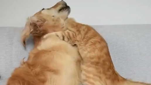 Золотистый ретривер хотел поиграть с котом. Но тот был против этого и прыгнул на него