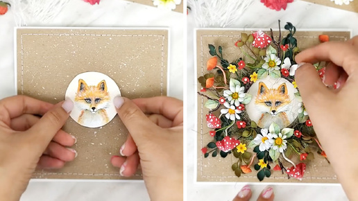 Миниатюрный декор из фоамирана и бумаги превращаю в шикарную открытку с лесной атмосферой. Процесс создания и готовый результат