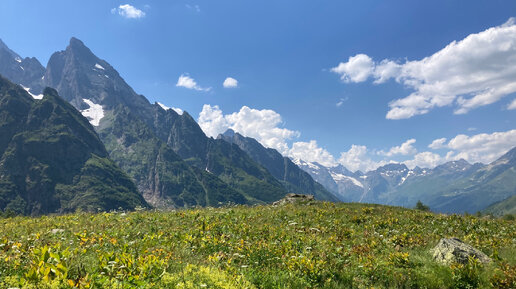 Ущелье Домбай-Ульген. Прекрасные виды Кавказских гор.